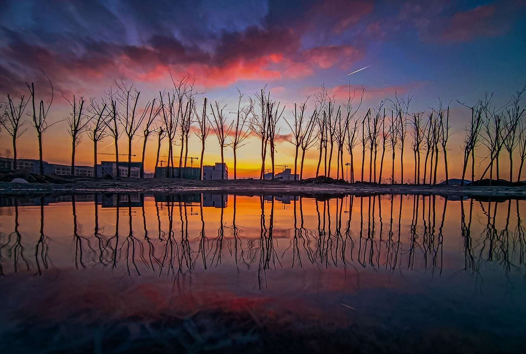 一个负面的例子如下:上个月下完雨后,在水坑里拍摄的校园日落。“守黑”不足,元素太多,图片就显得比较凌乱。后期便用了花哨的调色,试图来让颜色遮盖构图的不足,不过似乎矫枉过正了😓。
