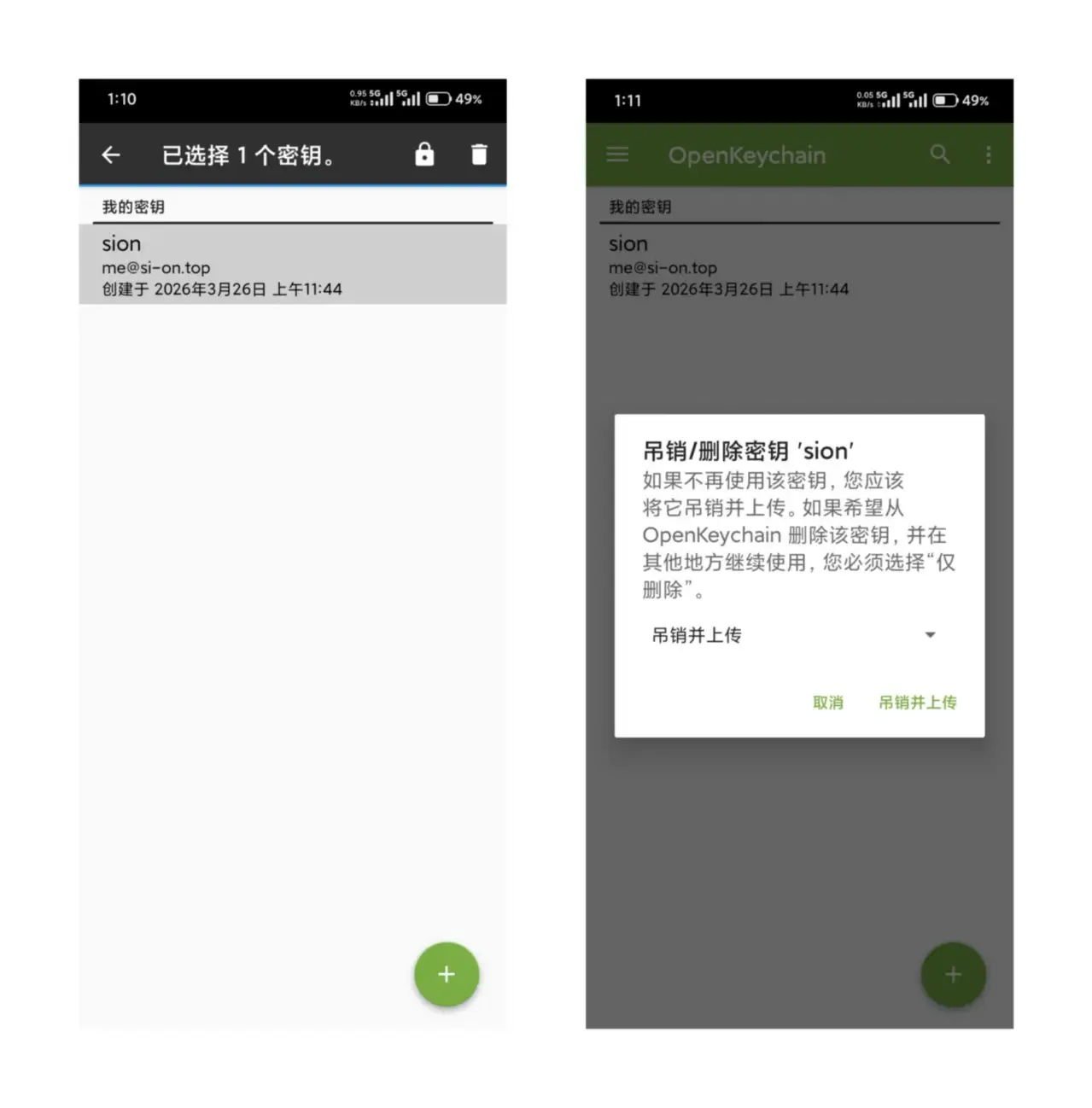 在OpenKeychain里可以直接吊销密钥,但密钥服务器里的吊销仍然需要点击邮箱里的链接进行确认,吊销之后再点击删除则会永久删除。