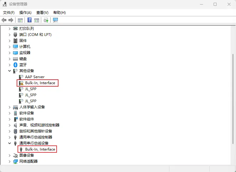 - 设备管理器中验证( 🪟 + X ,打开设备管理器),看到其他设备、通用串行总线设备下面有一个有个附带⚠️